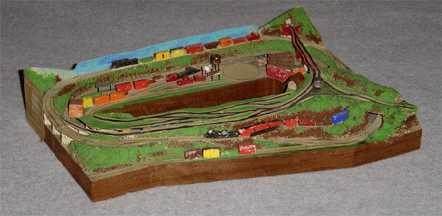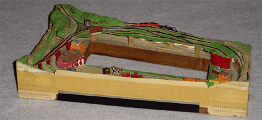 I made a 1-inch to the actual foot scale model of this layout by using the track plan drawn onto card stock paper and cut out with scissors before I built the real thing. I fashioned elevated tracks from accordion folded slivers of card and cars and locos cut with a razor blade from bits of Styrofoam. I was interested in proving the feasibility of some physical changes required by my cramped space that was one foot shorter with no room to walk around the outside of the layout. It was during this venture that I learned where my changes would not fit properly, such as the width at the lower end of Hillton. This mockup effort showed that I could include a hidden double-ended train staging yard below Hillton, a feature not shown on the original plan.