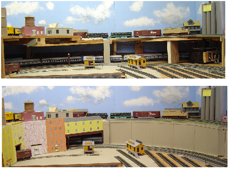 The new with and without tall buildings photos illustrate the value of double face buildings. The blank white panel on steel angle brackets in the middle of the upper level is the backside of the Mirage Warehouse in Hillton on the upper level. Here I learned that the upper level building flats could be pasted directly onto the backs of the tall city flats. The angle brackets are unnecessary. Another lesson learned.