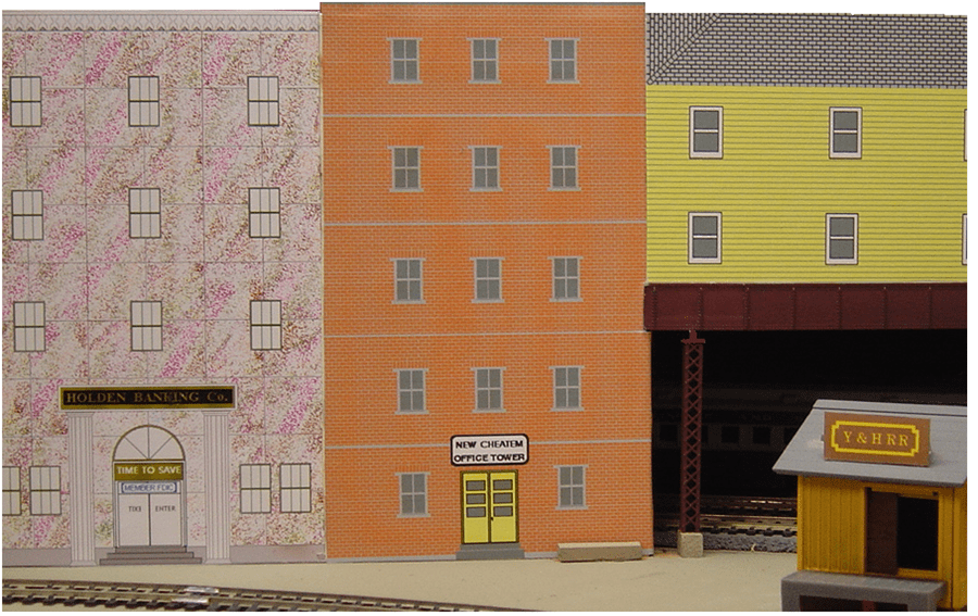 There are 4 major buildings here in the metropolis of down town Holden. I wanted to include buildings that were important to life in most any small town in a time before strip malls and shopping plazas. I wanted a familiar department store, a restaurant, an office building, and a bank. I used the home computer, its entry-level software, and color ink printer to make the flat front buildings. They were printed on card stock paper, cut to size with scissors, and pasted to a thin plastic board held in place with a magnet mounted on the bench work framing and a thin piece of steel glued to the back of the scenery panel. That makes for easy removal to retrieve a derailment if necessary. I spent many hours getting the size and proportion of these false buildings correct, but the only cost was time, glue, card stock paper and a supporting board. For that I used a 1/16-inch sheet of plastic after my first attempt using white glue and cardboard warped in time. But white glue did not hold to the plastic so I ended up using Walther’s Goo to fasten the card stock paper buildings to the plastic panels. This is probably better than water based glue, which tends to warp the paper. In the end I modified the sizes of all the buildings and did them all over again two stories taller. (Making them now over 11 inches tall).