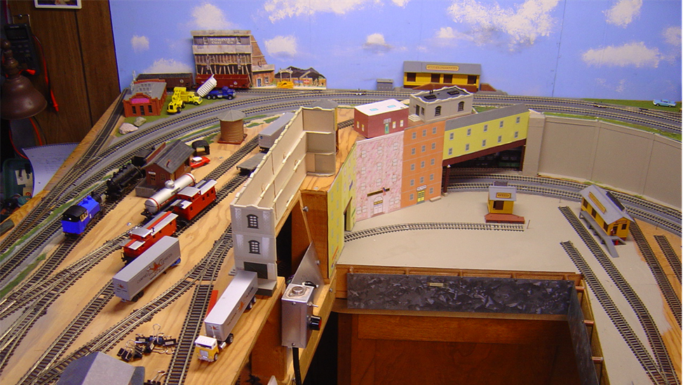 The photo above view shows my original efforts with the flawed logic. The tall buildings needed to be taller. This gave reason for rearranging tracks on the upper level. That turned out to be the best idea yet and really opened the area on both levels for growth and more freight traffic.