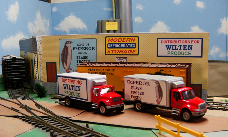 This shows how I got another industry that takes practically no table space right at the edge of the table by using double face building flats and it can accommodate both trucks and refrigerated rail cars. Both these industries are pasted onto the backs of the tall store flats along Commerce Street in Holden City on the lower level. I am pleased that this small industry can handle both rail cars and highway trucks. The illusion with flat buildings works best at near eye level. All it takes is an imagination with a time span of history that is flexible. Freelancing tolerates these modern refrigerated trucks that are too new to be seen with old time ice cooled refrigerator cars.