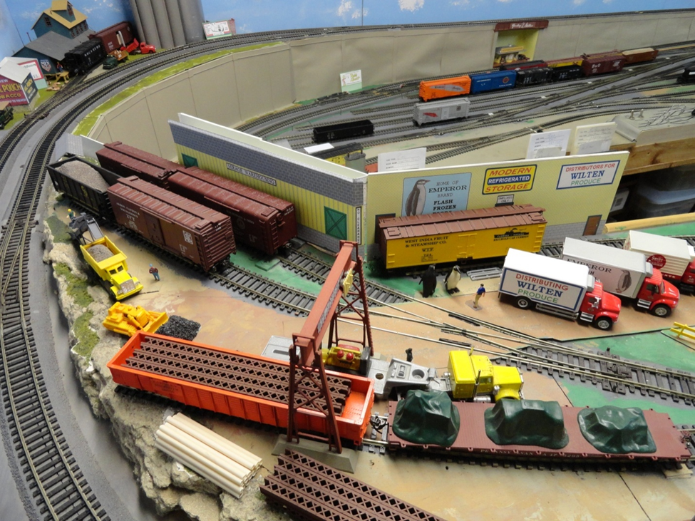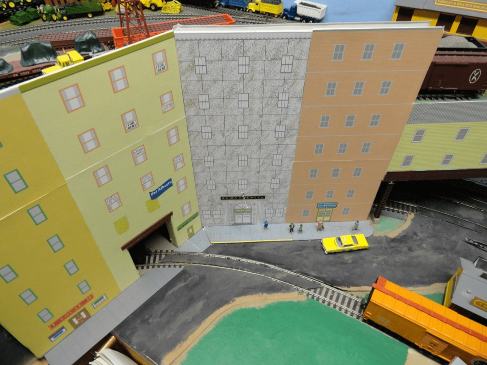 Now with the camera outside the pit at the town of Hillton on the upper level, we see the rail-served businesses consisting of a refrigerated storage facility, which can also handle highway trucks and a dry goods warehouse. These single story business flats are mounted on the back sides of the tall buildings of Holden City, track elevation 0. The tracks of Hillton are about 8 inches elevation.