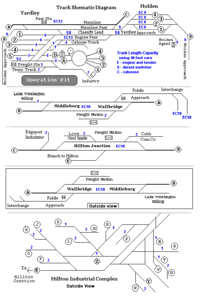 This sheet helps explain the Track Schematic Diagrams of each town as shown on the previous page. It is intended to support and add detail to the overall track plan. By using this straight-line scheme it makes labeling with a typewriter easier. Most curves are not shown. Track turnouts and curves are shown as 45 degree angles. Tracks crossing at grade level are shown as 90 degree angles. This drawing method causes lots of distortion when including the “Y” at Hillton. The blue printing is for understanding track car capacity.