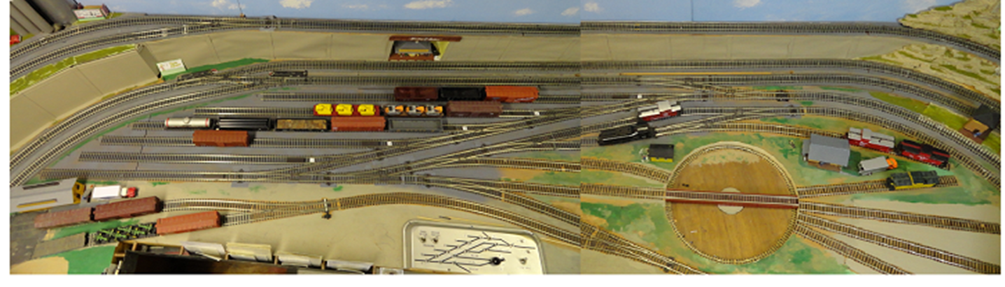 This easy to operate (while seated on a stool) Classification Yard – Roundhouse Engine facility accomplishes all the chores needed in a rather small space. It has two runaround tracks, both a car long and a train long. This yard can hold 3 trains worth of cars, cabooses and locomotives.