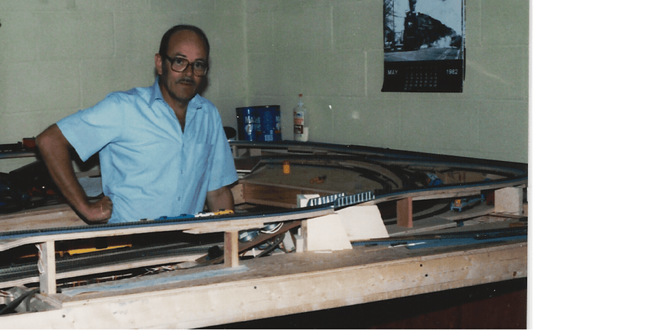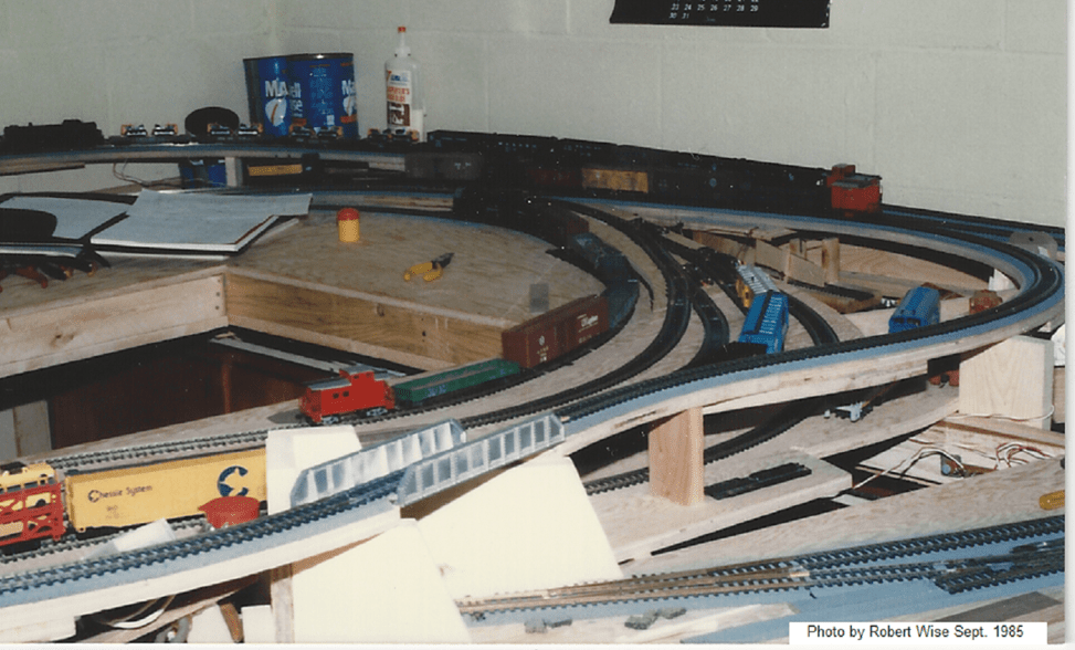 It shows mainline trackage on risers that is now hidden inside tunnels. It looks like the classification yard drill track/engine facalities track were not yet finalized. I remember running trains forward and backward on the Holden staging tracks for hours of testing. The blue coffee cans in the corner are where the Hillton big bridge terminates in the Wherezatgo tunnel.