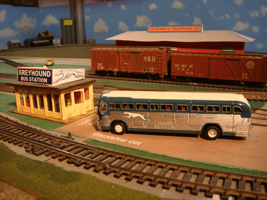 Then many years later while browsing the internet eBay one day I stumbled upon a nice Greyhound Bus Station sign. I was not interested in a 3-foot long sign but I did like the graphic of the dog and the colors. Those I captured into the computer and got busy making my own sign that would fit my over 20 year’s old bus station. It is easy to get the dog facing the other way with software. Then in 2007 Classic Metal Works announced a properly scaled 1950s era Greyhound bus.