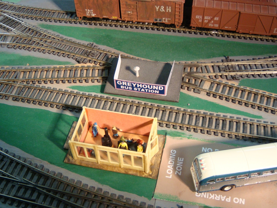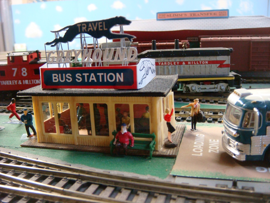 The town’s people of Hillton, an industrial rail town, were happy to see a bus station built near the train station. Now maybe people could go someplace. Many years ago I had a plastic two story European style Interlocking building, which I did not care for. So I cut the bottom story off making a separate building and used the upper story with lots of windows as a bus station. Everyone knows that after the trains quit hauling passengers, people had to ride the bus. I made a flat roof of thin scribed wood stock and covered it with sandpaper to look like gravel roof material. I placed several figures that I had painted inside – waiting for the bus. There were chairs and benches for seating and a stove for warmth. The interior was colored card stock (IBM card). I made the roof removable to allow visiting spectators a view of the inside. Here are some photos.