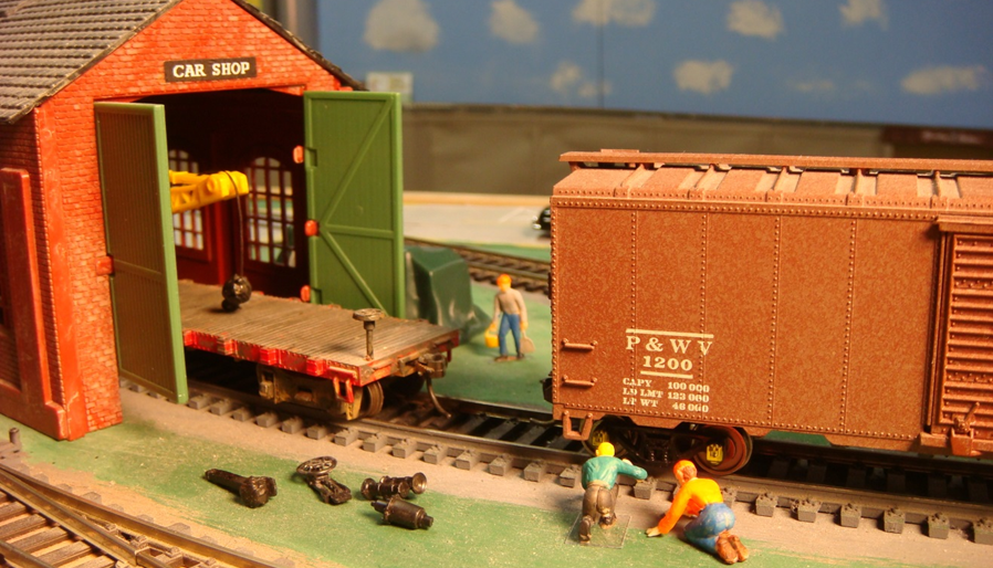 The Y&H has a shop for light rail car repairs at Hillton. If needed, it can also be used as the paint shop for WREX jobs. A small rail born crane and its old flat car boom tender is housed there. Here we see both sides of a boxcar under repair. Perhaps the car needs new journal brasses or brake shoes.