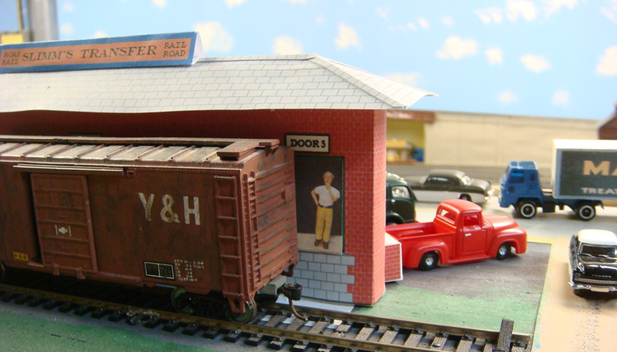 Here we see a man with a puzzled look about himself (you may have seen him elsewhere on the layout) standing in the doorway on the railcar side of Slimm’s Freight Transfer Warehouse. This building was made with the computer Paint drawing program, printed on card stock paper, folded and glued together with a half inch thick block of wood inside to help hold the shape. This whole building illustrates ‘selective compression’ — most of the building was compressed into nonexistence!