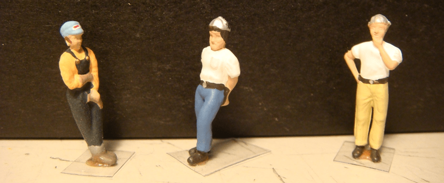 Populating the layout with people doing chores adds reality. Showing workers on the job at structures is always rewarding. For a long time I resisted using fancy store bought finely detailed people with suspenders and belt buckles because I thought they were too expensive. However after painting a couple dozen I began to change my opinion. My painted people are good enough for background quality ‘arm’s length’ viewing. We can create activity scenes around the layout that can speak to the camera if we populate them with folks involved with some kind of action.