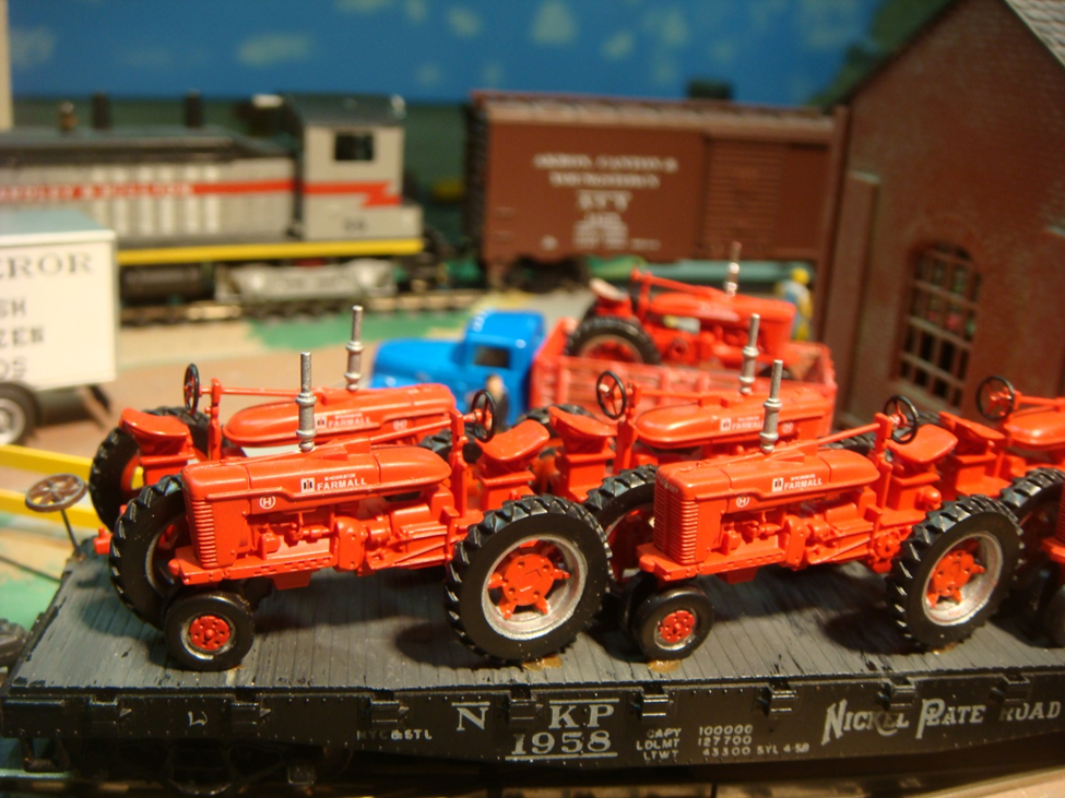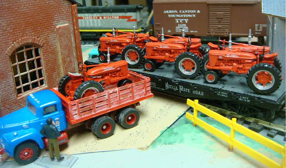 Here these close-up shots represent a scene I participated in as a young man of 18 unloading Farmall tractors off the flat car. I took these larger than life pictures on my layout with a Sony T100 digital camera in close up mode. The truck has had a body swap and a bit of weathering paint. These tiny decals are the smallest I have ever attempted. This was quite difficult for me. Maybe I am getting too old for them. I solicited help with this job of painting the wheel rims and the decals which are properly scaled and colored and reminiscent of events of the 1950s.