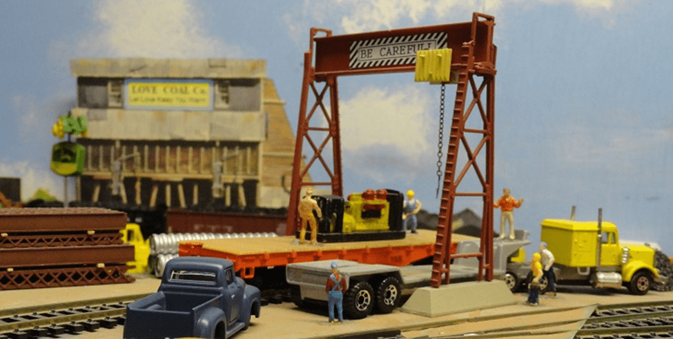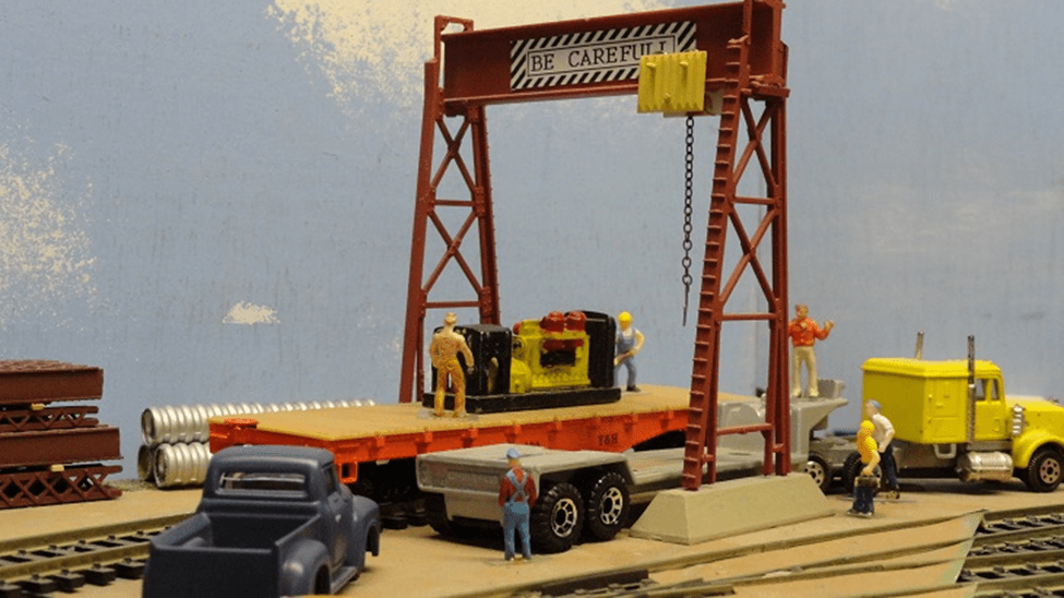 The overhead crane at Hillton can be used for all kinds of heavy material. Here the workmen are unloading an electrical generator from a flat car to the low-boy truck. They are to take it up town for auxiliary power in the Hotel Hilton. I am not sure how they will unload it when it gets there — I thought about using a false background of sky to block the view of the coal tipple.