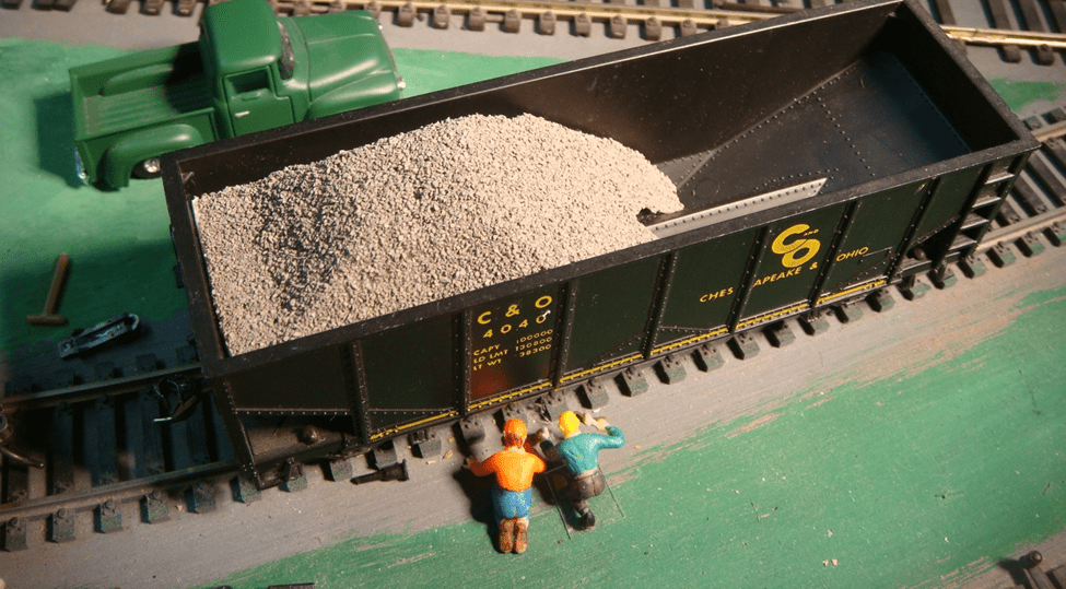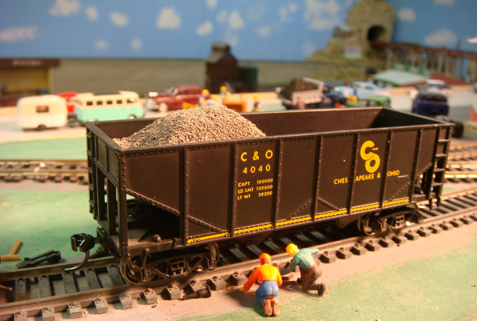 The car is unusual. It is by Revell-1956. It has more rivets inside than the popular hoppers of this day and age (See photo on next page). The load was made by shaping a block of Styrofoam and gluing it to a piece of card that had been fitted to the hopper bottom contour, then painting both with white glue and dipping it into a container of ‘N’ scale ballast.
