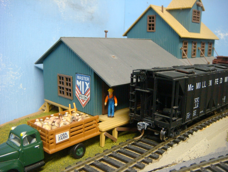 Later in my travels I found a black covered hopper car by Bowser labeled “McMILLEN FEED MILLS” built in 1953, reporting marks CSX 112 which I am pretty sure, was this same company. (Possibly Central Soya?). Here together is the seldom seen McMillen Feed Mills covered hopper used for shipping livestock feed grain and my Master Mix Feed sign at the feed mill in Hillton Junction.