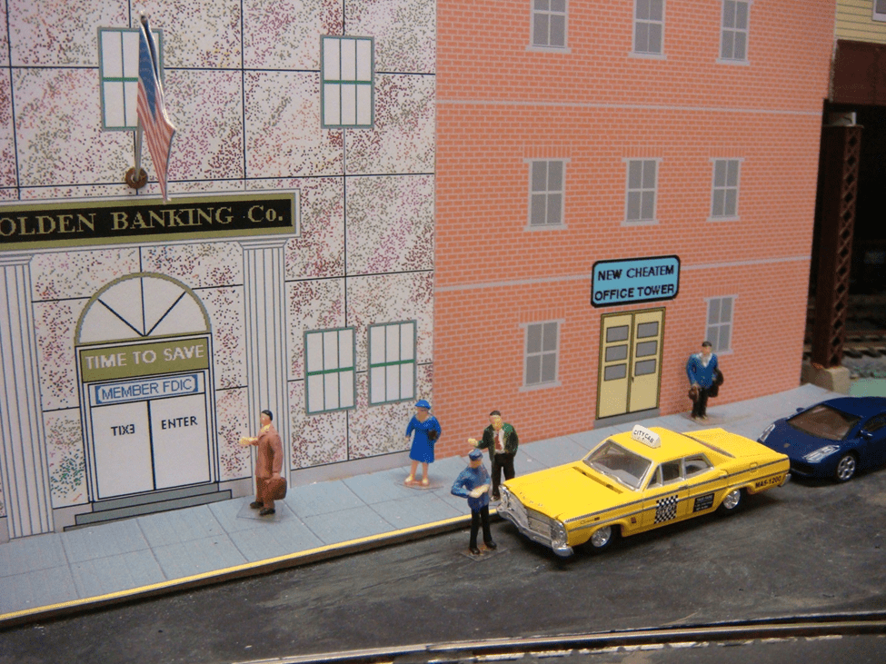 The time is shortly after 9AM. Folks are coming to the bank. The bank building has smooth polished marble facing, made by printing the homemade graphic on glossy photo paper. No two of those multiple colored marble panels are exactly alike, and the stepped entrance. It is rumored that the lady in the blue dress with her purse has a lot of money. The street pavement in the foreground is painted card stock paper. The ‘embedded’ rails lead to Holden freight station. The embedding was done by raising the paper pavement with heavy cardboard stripes underneath.