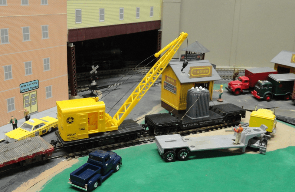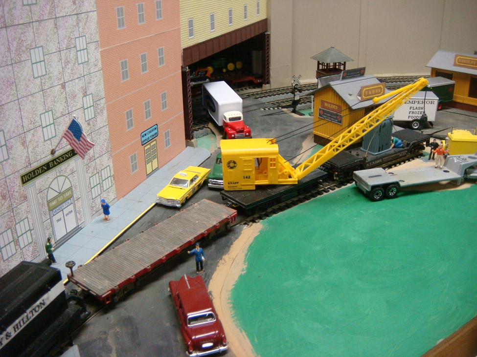 Normally the freight agent at Holden handles mostly lcl packaged freight for the offices in Holden City. Today things are different. With the Cheatem Office expansion into the new space afforded by the building of two floors of new office space in the old bridge work – more electrical power capacity was needed for those new offices. Today we see snarled vehicle traffic with the arrival the big transformer to provide that needed power. This shipment was accompanied by the rail born crane from the Hillton Car Shop to off load the transformer to the low boy truck for final delivery to around back of the Cheatem Office Building.