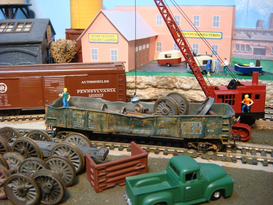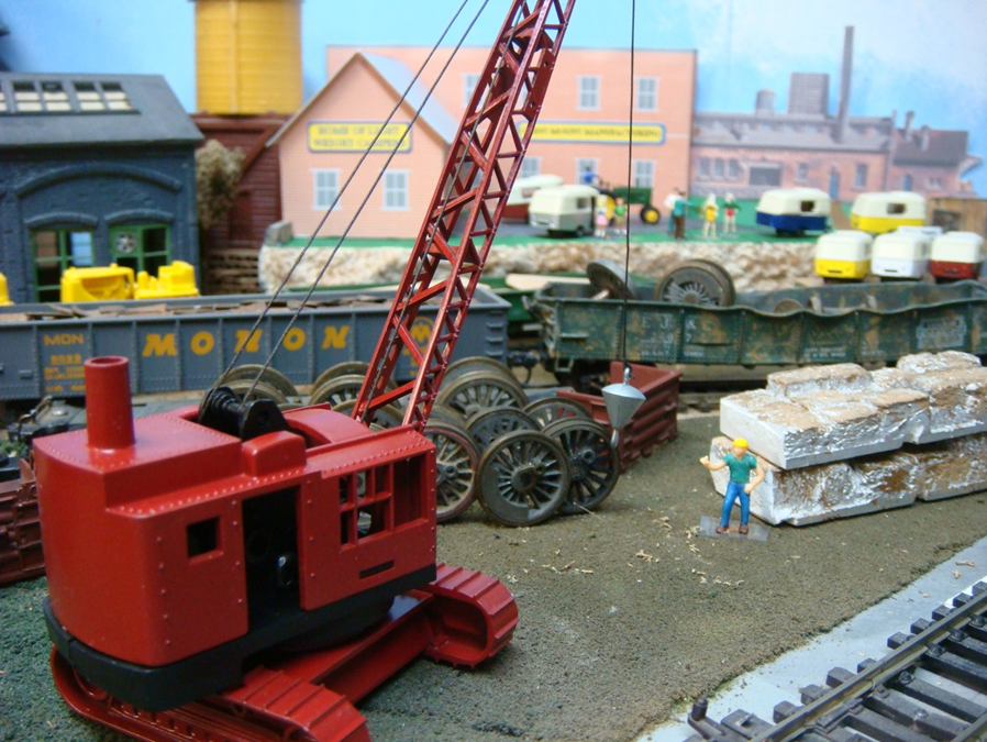 The crane is a Life Like Scene Masters kit after repainting to make the lattice bracing on the boom more visible and re-stringing with finer gauge braided silk fishing line. The man inside had his foot cut off so he would fit. Sometimes you can make a figure work better by altering its posture. The welders with the cutting torches are from Woodland Scenics. The acetylene tank cart was made with wheels from one of those abundant Crest Mount trailers and bent wire. The sacrificial trailer, with its top removed, is tilted against the factory wall to display its spacious interior! In the distant background of the top-most photo is a glimpse of the compressed (half-sized photocopy) of the Leming Compressed Gas Factory, a Walthers paper flat.