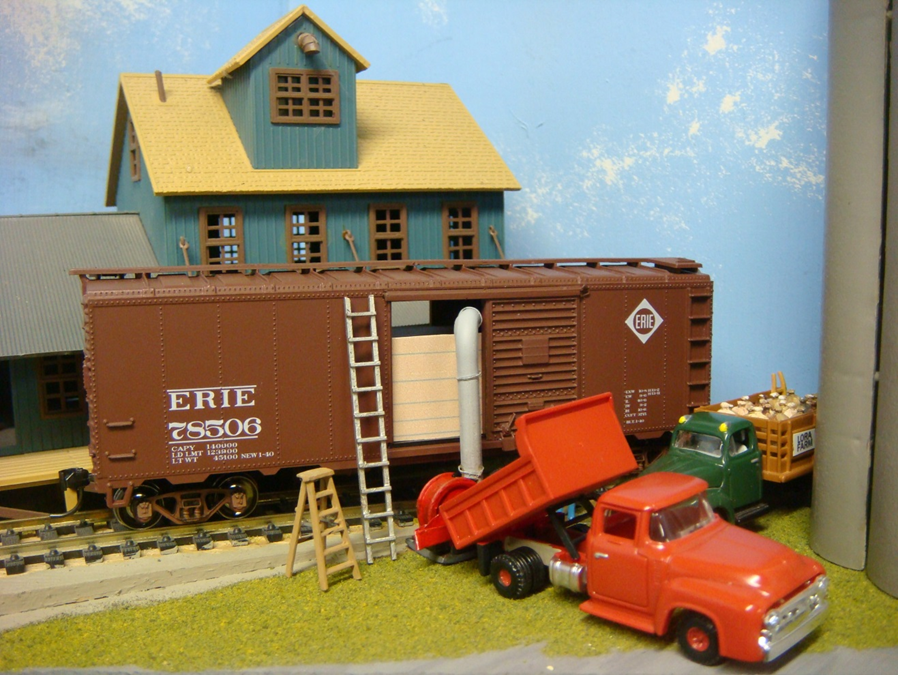 I have attempted to model scenes of this action as I recall from my youth. My efforts required scratch building, as I could not find a suitable blower in 1/87 scale. I did not spend too much time here because it is only for the camera. The details are in the story not in the photograph as the blower is nearly invisible tucked under the car and behind the truck when in operation. The blower was mounted on runners and had to be dragged to the next car when this one was full and dragged out of the way if the railroad came to move cars.