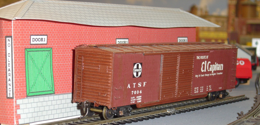 The box car is an old L&W Models wood kit with scribed wood sides, silk screen painted, the ends and doors are cast metal and painted by hand. I built it while camping with my family in the summer of 1984. For weight I used stones from the driveway gooed to the floor. I had no scales. Later I realized it weighed over 8 oz.! So I popped off one door and removed a couple stones.