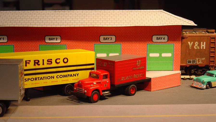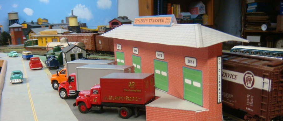 Desperation fosters creativity: Here is my super thin building for my lcl freight transfer operation which transfers less than car-load freight between highway trucks and the railroad. I was trying to get a big operation into a small space. The Slimm’s Transfer Co. transfers road to rail and rail to road less than carload lot freight. This type of operation is long gone from today’s railroading. My home made building is located right in the middle of town and right in the middle of my table. This thin building only looks good when viewed from straight on. One side of the building handles rail cars the other side serves highway trucks on Hillton’s newly paved Exchange Street.