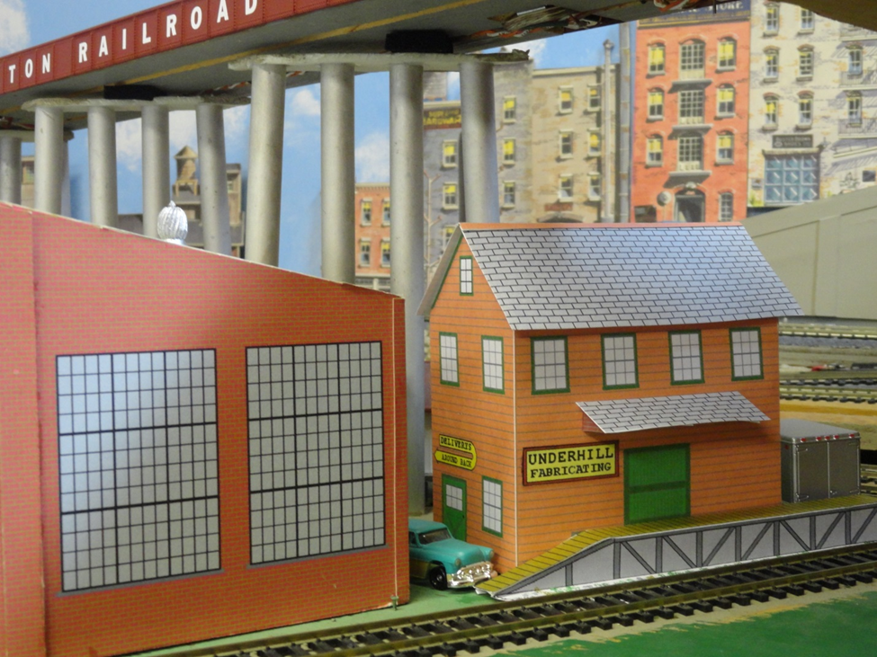 Underhill Fabricating Building located behind the roundhouse and under the Hillton big bridge. The loading dock could be made either handed or fixed to the track to have a ramp at one end and steps by Central Valley at the other. Maybe it could have a shorter truck dock on the back side in addition to the longer one on the rail side as shown above. I think the building can be used for many different kinds of industries. One could vary the window count for the second story. It could be a fabric uniform or shirt factory (lots of windows for natural light). A cigar factory would need fewer windows. I originally had two sliding doors at the dock level but it just seemed too busy, so now there is the single sliding door.