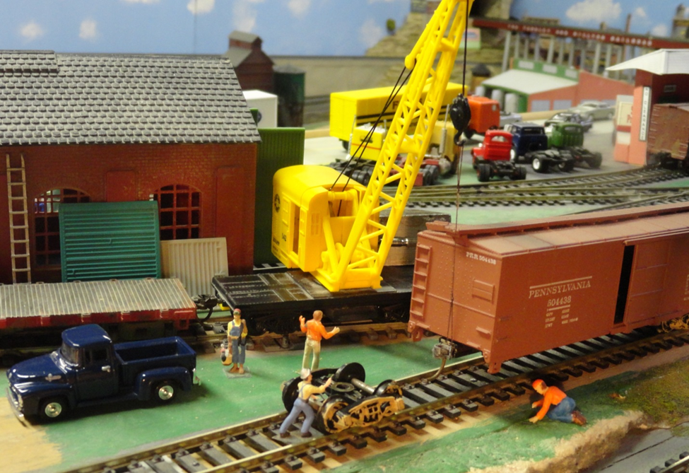 On the Yardley and Hillton we have seen a variation of ‘roadside repair’ as a follow-up to the Chicago Hard Stop story. They are using their 25 ton rail born crane from the car repair shop to lift the end of the car with a wire rope cable around the coupler and perform the necessary repairs to car or truck bolster and brake linkage. With our models, a setting, a camera and our memory we can make a scene very reminiscent of long ago events that struck our memory. Lately it seems that I enjoy making scenes like this more than running my trains. Is that because of the tremor in my hand or a desire for challenge? This page & picture represents over 4 hours of my retired time and I find it is more enjoyable than TV.