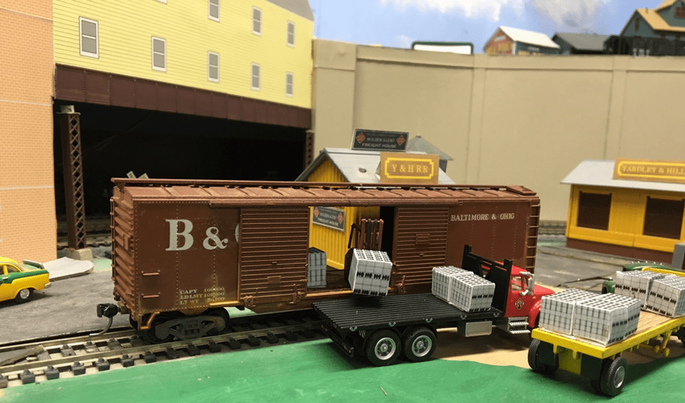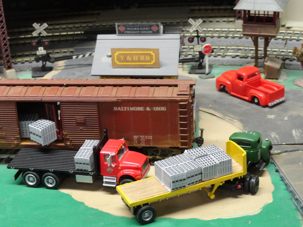 This distant scene shows a bit more of the action. The lady in the blue dress on the side walk to the left is going to the bank, there is a taxi cab at the Cheatem Office Tower, red pick-up truck is waiting to cross the main line tracks into the shadows below the steel panel bridge. I believe that a heavy load like stacked or palletized bricks would be placed in the car above the cars trucks – not wall to wall and end to end. Heavy loads in railcars are always placed over the wheels. Notice steel ingots in gondola cars, when there are just two pieces to a load, they are always placed above the wheels, this practice is easier on the car frame. And with palletized bricks or blocks it could leave a space in the center of the car for a fork lift to enter and turn around inside the car. Observations during a recent drive past the brick yard provided inspiration for this story.