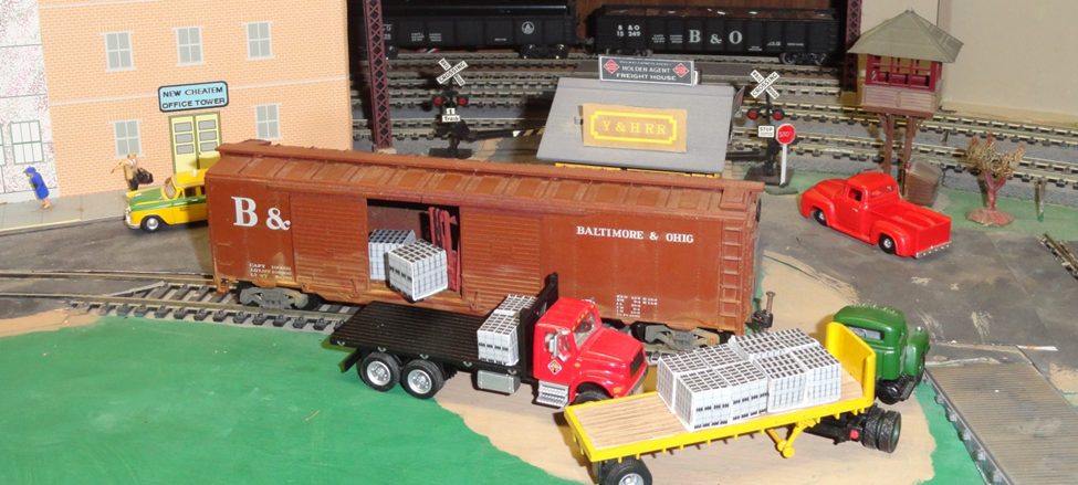 This Athearn 50 foot double door box car was a flea market find with “natural” weathering. I think it had been in a basement flood which rusted the steel weight and stained the lower plastic car sides and trucks. The yellow flatbed truck is a chopped Athearn and its green International tractor has no fifth wheel for proper hitch height (for the cameraman). The red modern International tandem axel (twin screws) is designed for heavy loads. The elevated crossing watchman’s shanty won’t be needed much longer after the automated crossing gates are here now. There are a couple more shots of this scene below.