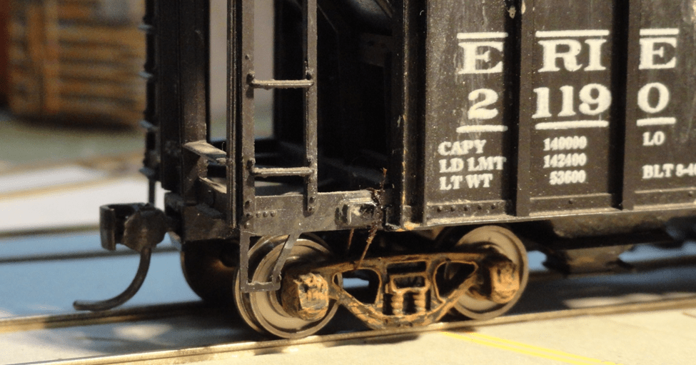 Hospital Train: Heavily damaged cars were carried to repairs on flat or gondola cars. This car is for the ‘hospital train’. Its wheels have become lost so we will send this hopper from a wreck site to the wreck repair or scrap boys without any more damage to the bottom side. I had no HO scale chain so I used brown thread instead as a tie-down cable.