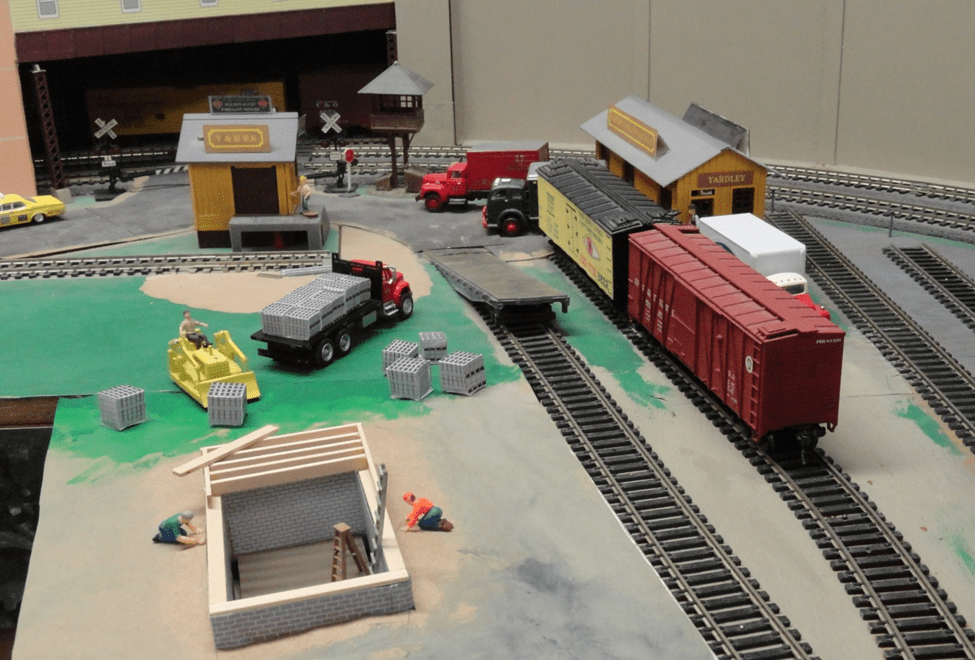 Here we see how the industry spur track may work at the new Yardley Industry Park at the former engine roundhouse facility. We see some development happening already, the two bulldozers are tending the grading, there is a dump truck of roadway material and things are moving right along. Both the Ohio Barn and the yellow house are homemade with the computer and printed on card stock paper. Here you can see where my heart truly is – with steam locomotives, farm tractors & bulldozers. But I realize that diesel locomotives are here to stay.