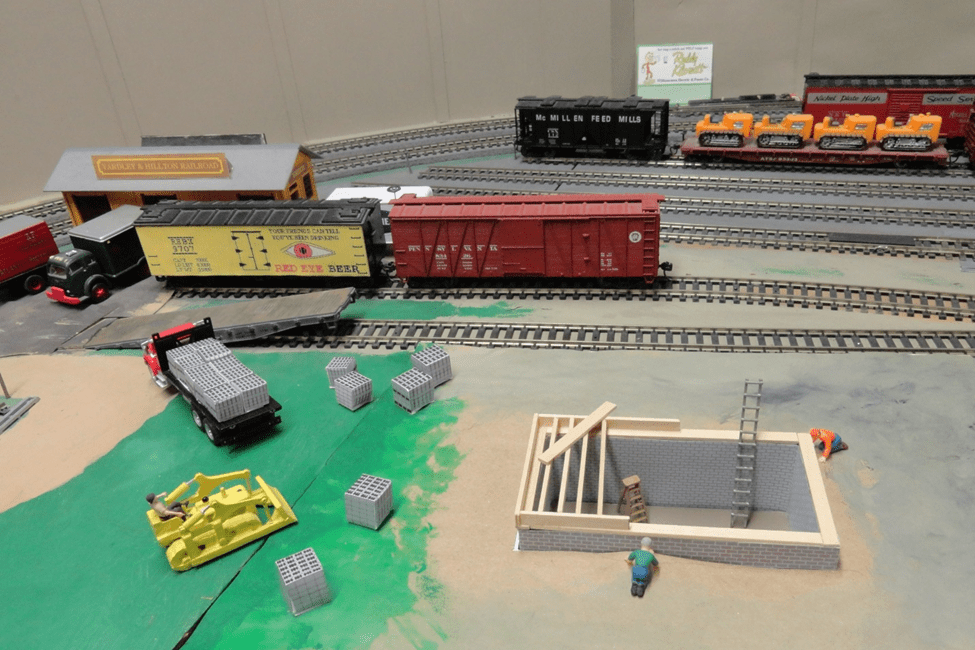 There is a lot going on at ground level in this view. At the very far right is a box car spotted at the Underhill Fabricating building. A truck load of concrete blocks and the new basement construction project can be seen in the corner of the layout operation pit, employee’s vehicles are parked at the diesel house. This photo has been retouched to hide the edges of the brown paper.