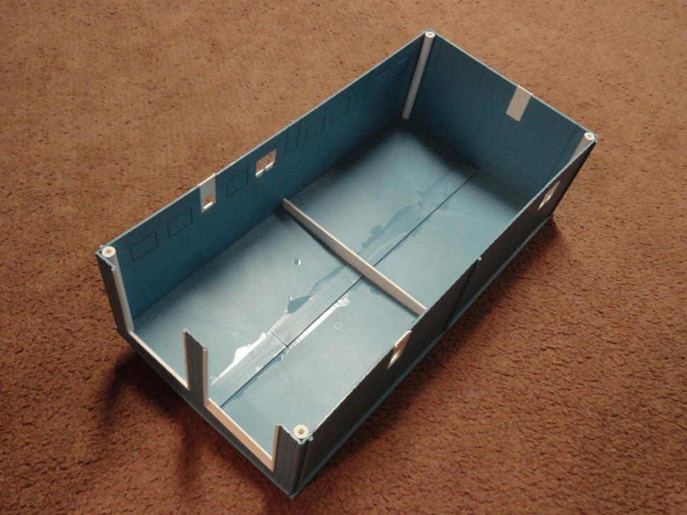 After finishing the ‘basement under construction’ project using more than the last square foot of vacant geography on the layout, I felt that if I rearranged some structures I could have a modern diesel engine house and I needed a project to busy my fingers for the winter. I had enough sheet vinyl stock to build the structure but I wanted to try a kit built. I bought a modern diesel house kit by Pike Stuff because I thought it would save some time. Maybe it would have been better to scratch build after correcting the short comings of the kit’s design. There was lots of internal bracing required that should have been included with the kit. I think the design – if built with just the edges provided for glue contact, one could not move the structure without it falling apart! So I built it with added internal bracing (the white material in the illustration below) taking several days to allow glue sessions to dry strong. I used liquid plastic cement and thick wall plastic tubing in the corners mounted at just the right height to help support the roof and a homemade brace across the center to secure the roof to the walls for much needed strength. Now my building is strong enough for light handling.