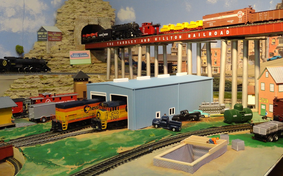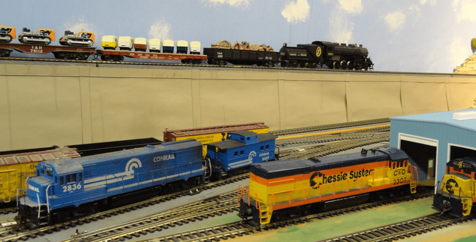 This distant view shows the diesel house on stall tracks 2&3 of the former round house. The Mail Pouch barn is out of place and should not be in this picture, shame on the photographer’s carelessness. This arrangement gains no more industrial space. It seems to waste space used by two approach tracks to the turntable. Maybe we could eliminate the caboose stores building and its short runaround for really modern times. The Conrail units are on the classification drill track near the Yard Master’s Tower. I have very few diesel road locomotives, it seems that I like steam better and I have little interest in diesels. The steam powered train in the background is on the mainline coming down from Hillton. There is more traffic on the big bridge at Hillton.