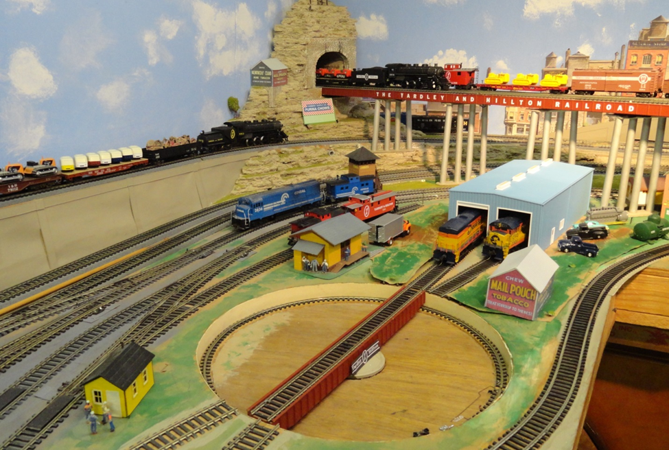 My layout needed more industrial space and this new found real-estate could bring new industries to the town of Yardley that never had many. I guess Yardley had so many railroad facilities there was no room for industry. But after taking over a hundred hours to build my roundhouse and turntable that works, I am not about to tear it up, maybe we can fool the camera with temporary scenery for this project. The local real-estate developer has lots of ideas. He was thinking about a road way connecting the Underhill Fabricating Co. to the caboose stores house in the yard with a crossing at grade over the new industrial spur track. Eliminating the roundhouse could reveal valuable real estate. Development may come fast.