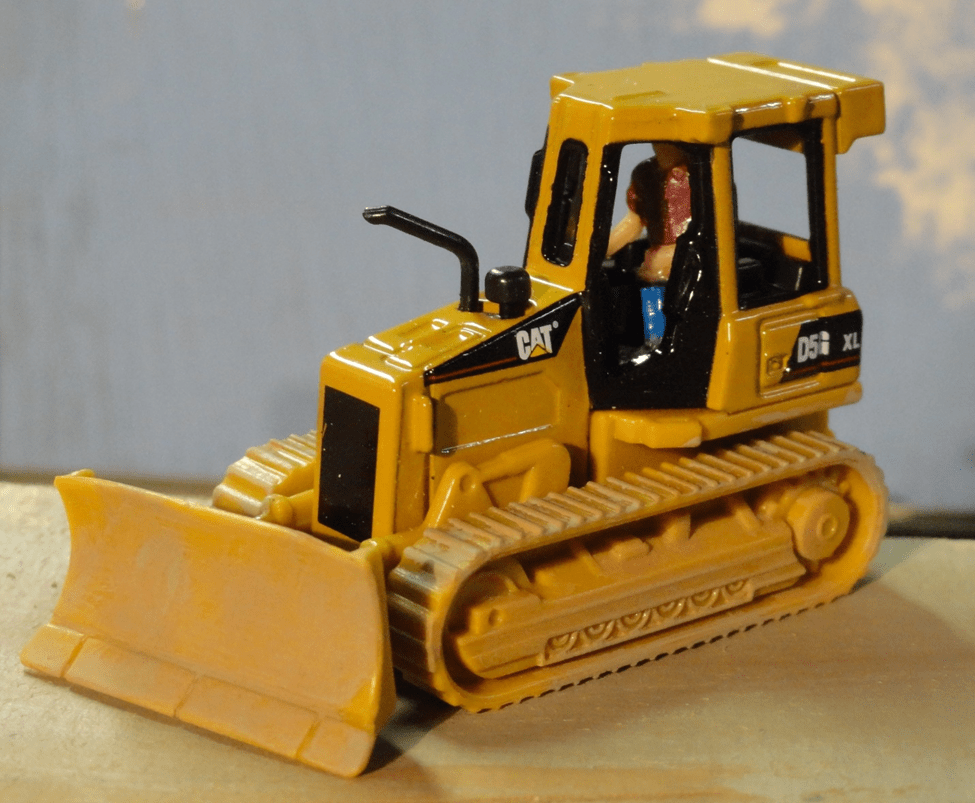 I had a couple Caterpillar model D5GXL bull dozers by Norscot that I had found at a train market. They came mounted in a neat little display case. I thought I might use them in close-up pictures of a construction operation. I put a slight bit of tan weather with acrylic dry brush to the crawler tracks and bull dozer blade. I thought I should put an operator in one of them for more of an action scene.