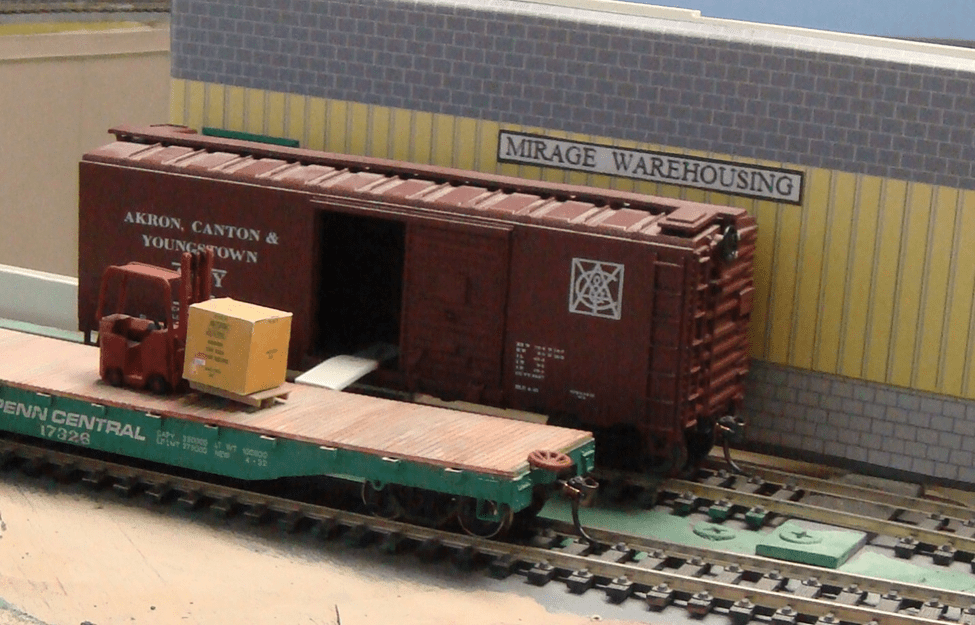 I wanted to illustrate this concept on my layout – but with a boxcar on the near track it would obscure a good view of the action. So with a bit of imagination (x-ray vision?) consider the Penn Central flat car to be a box car. And that we are working through the first car (boxcar) with the fork lift to get to the second car, (flatcar) both box cars would have both doors open. Consider the fork lift on the flat as if it was on a wall-less box car.