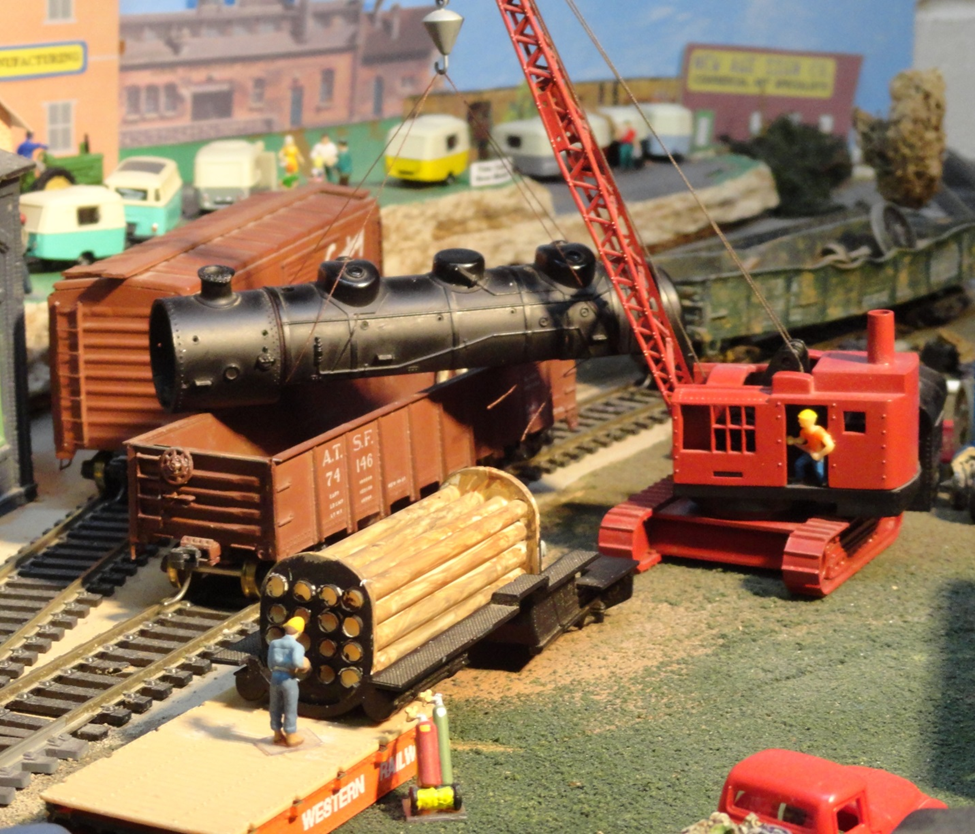 I wanted an action scene at the scrap yard in Hillton. This is my version of a partially cut up steam locomotive showing the many tubes in the boiler. This is another place that won’t scale properly with my shaky hand. I had a large bundle of thin plastic tubes from an old sun shade formerly used on the back porch. I thought those tan colored thin plastic tubes might be suitable as rusty flues in a scraped boiler. I used the computer to make a printed grid for uniform spacing of those many flues. I used sheet vinyl for the flue sheet because it is easy to work with a file and a drill. I temporarily glued two flue sheets together back to back and the printed grid was glued to the stack, then all the holes were drilled through everything, the paper discarded, and the drilled flue sheets were separated. Black and tan paint was brushed with water base acrylics. As it turned out my flues and the sheets were quite a bit oversize.