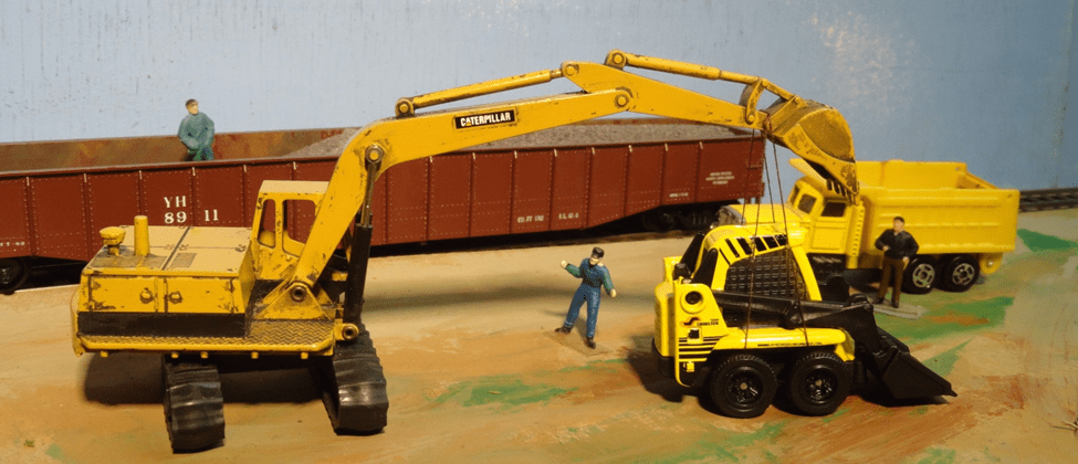 We must start the story at a model train flea market where I was able to find the large crawler mounted back hoe painted like Caterpillar and a small front end loader like a bobcat in HO scale – both are required for the story, (I was glad that I found two) for this exercise for the camera.