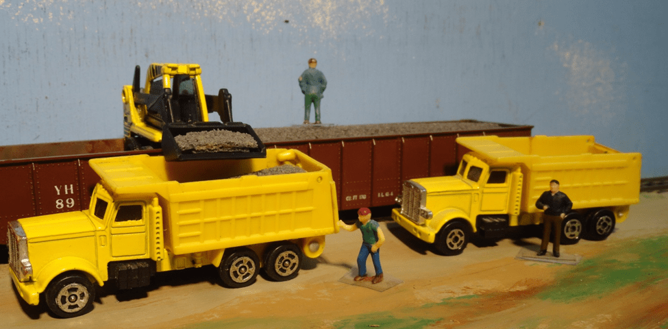 After the layout is finished it can be used as a test track for hours of break- in running for a locomotive. Or it can be used to set up a scene to photograph in support of a story. I temporarily removed the Love coal tipple and the John Deere dealership to use the space for this photo adventure. The hardest part of this job was the tying of the brown thread to make a suitable sling for lifting the front end loader into the rail car, with my fumble fingers; I spent nearly 3 hours on that chore. The car is an Athearn 50 foot gondola that has been stretched to 62 feet, by the sectioning of another car and adding it to this one, then it was spray painted and decaled for the Yardley and Hillton in November of 1989. The load material was formerly underlayment for kitchen flooring stripped of one layer of Mylar film. The photo was taken in April 2016 at Hillton Junction not at the team track. I was surprised that the front end loader was still too long to set crossways inside the gondola (maybe it is a bit oversize). I have two bobcats; one has been shortened about a half inch with the bench grinder in the garage to fit cross ways inside the gondola. I now wish that I would have painted the bobcat bucket yellow but disassembly required drilling out a couple rivets and then it would want to fall apart. The weathering on the back hoe accentuates the Caterpillar Yellow with its hint of tan color. The placement of workers adds meaning and action to the story. All totaled I have probably spent over 12 hours on this venture including modifying the models, photographing and writing, setting up the scene with painted card stock ground board (to raise the surface to rail-head height) simulating the dirt paved ground at the team track. I used my sky board background from another project to hide the electrical outlet on the wall.