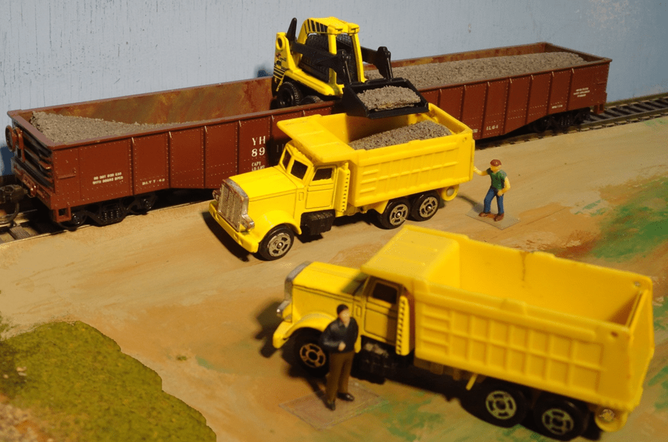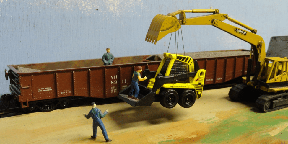They tried to use a big back hoe to empty the gondola but that did not work well, too much hand work inside the car because the back hoe could not clear the corners well. A small nimble front end loader – probably a Bobcat did a much better job, it could turnaround within the walls of the car, and was light enough to be picked up and put into the car by the big crawler mounted back hoe. The front end loader could easily dump into a truck parked alongside the rail car.