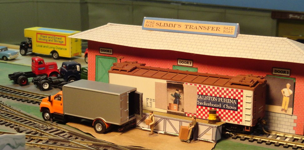 Here is the Candy Man unloading at the Holden City Freight Depot. The black pickup truck has its tailgate sawn open and the men are using a slide ramp to assist with the unloading. The bean counter in his gray jacket is there with his ever present clip board checking inventory.
