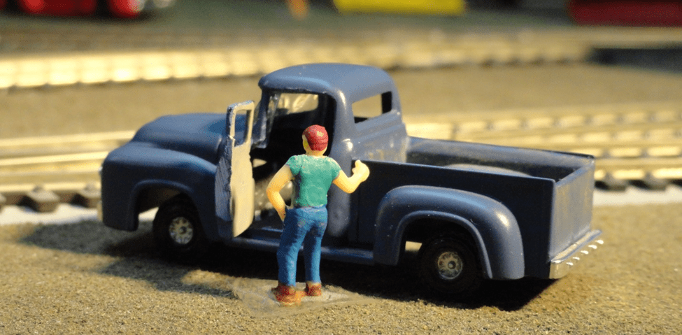 I thought I would try opening the door of a pickup truck for another scene of action on the layout. I had a few LifeLike pickup trucks that look good enough for arm’s length observation so I tackled the job of opening the driver’s side door, planning to glue the door back on now permanently open. I planned on the job taking at least two trucks because you will lose a door and a cab by cutting it up with this process, you should use trucks of the same color to save painting. I filed a chamfered edge to both the door and body at the hinge line. The tools required for removal of the first door were a sharp Xacto knife, a hand drill, sprue cutters, files and an emery board. I learned that one should give lots of thought to this task. I accidently broke the door’s window frame but was able to save it with a drop of plastic cement. It might be wise to have a third truck on hand if you mess up big time.