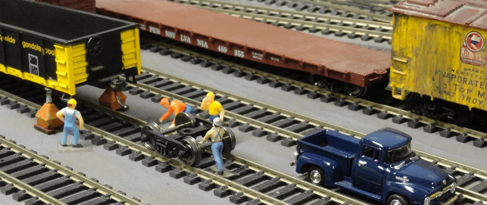 I wanted a story of how RR car repairmen sometimes work in the field. I had to scratch build a pair of 20 ton hydraulic jacks to support the car. I used a couple extra roundhouse ventilators after cutting off the veined rotary on top. Then I drilled a hole for a shortened finishing nail as the cylinder part of the jack and cut portions of RR tie as blocking for leveling below the jack. I should have made a pair of handles on each jack as they are too heavy for one man to handle, but the tremor in my hand that comes with age made it too difficult. I painted them with brushed acrylics. 6-16-15.