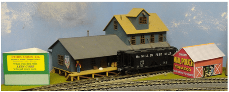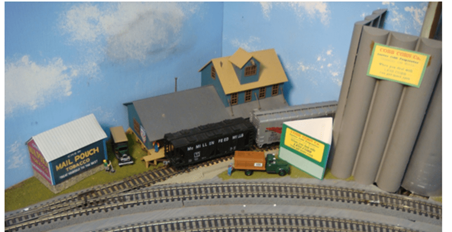 This is an overall photo of the original location of the Cobb Corn & Grist Mill Co. in a corner of the layout at Hillton Junction as it had existed for several years. I always had a grist mill for the grinding of cattle feed and other supporting scenery there. Such as the grain storage silos on the right that hides a gas pipe, a 3-sided billboard and of course one of my Mail Pouch barns which became a virtual storage shed for a virtual tractor. Local harvest time lasted a month – marketing time (Pillsbury baking flour) lasted all year-long.