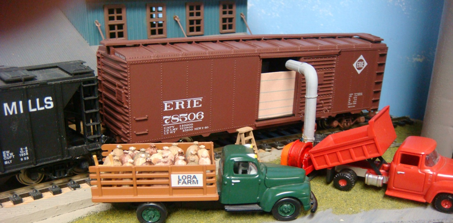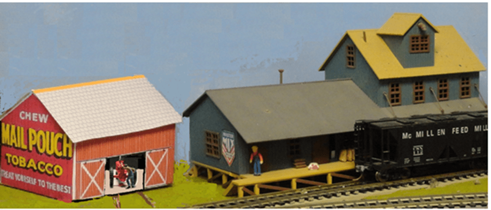 Often there was a busy scene to be found here for traffic on the railroad. Such as handling cattle feed in burlap sacks or loading grain into boxcars about 1950. I used the computer graphics program to make modifications to some old photos of the layout for a new story. That experiment is shown on the next page. (The Mail Pouch Barn on this post is REAL).