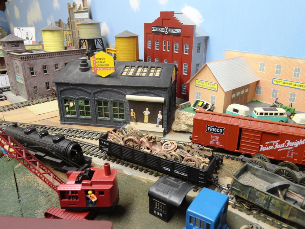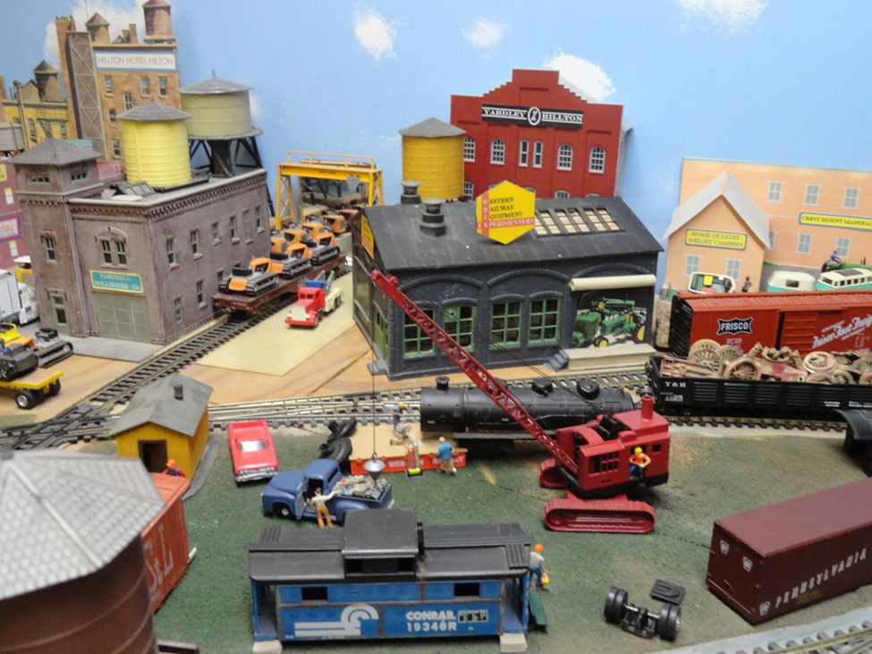 In the direct foreground is the Conrail caboose ‘office’ minus its running gear mounted on concrete footings with a resting bench at the right end, a pickup truck with a load of scrap iron under the crane, an old steam engine boiler being cut up for scrap by the workmen with an acetylene torch and a gondola load of scrap. In the background is the bulldozer factory with a flat car load of dozers, our WREX equipment structure, the head office building of the Y&H RR, and the edge of the travel trailer factory behind the Frisco box car.