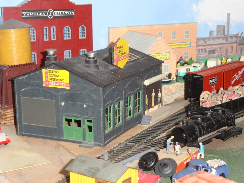 I thought if the Western Railway Equipment eXperimenters had a back door and a loading dock the company could do extra work in addition to railroad work when things get slow. This is a way to get new traffic from an old industry. The structure’s large panel with windows is located between the steel frame work (underneath the bricks) and that panel could be removed without damaging the strength of the building, and then that opening could be closed with a large overhead roll-up door as sometimes seen with modern buildings. This would allow us to see more action inside the building. The housing for the rolled-up door was made from a plastic drinking straw for the roll mounted high and a small dock at ground level to serve rail cars. Both are fastened to the raised brick surface which stands about 1/16 inch proud of the brick wall. This leaves a small slot for mounting a photo of activities seen inside. I was attempting a new spin on an old idea. Those 3 men standing in the door-way at the dock look familiar.