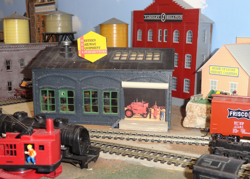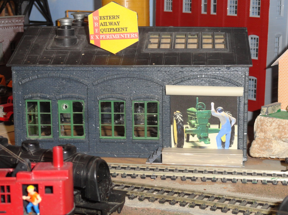 The overhead roll-up door housing is fastened to the raised brick frame as is the scratch built dock floor below. The brick wall has not been cut out so the building structure is not damaged with my experiment. This provides a small slot to hold a paper photo insert loosely in the space which can be changed to suit another business. This changeable photo insert is an idea to allow for occasional changing of the vehicles or products built inside. Most probably vehicles other than railcars. That is how these factory work-men could stay busy during slow railroad times. I thought about other tractor manufacturers contracting with WREX for assembling tractors from previously sent parts. It is apparent that both Farmall and John Deere have had work done here. Parts could arrive in box cars and assembled tractors could be shipped out on flat cars. This nearly unbelievable idea is how a small local business can get into big time shipping operations on this small railroad. And this way we can get a bit more mileage from an old industry.