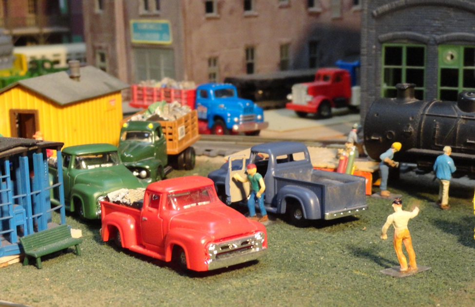 Here my 4 truckloads of scrap-iron are seen on Exchange Street in Hillton. In the foreground is my hollow home-made paper moving van cover “Frank and Ernest Moving and Storage” fitted on a conventional box truck. The Hillton Freight-Passenger Station is in background. The scrap iron drive looks like a parade of various trucks.