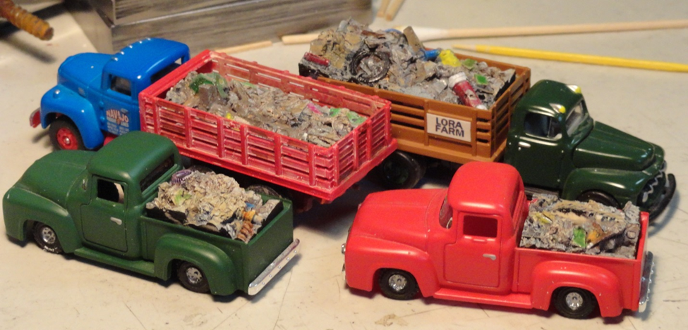 It is not necessary for all the scenes on the layout to deal with train movements. At a train flea market I bought a highly detailed cast resin gondola load of scrap, (or is it the ashes of a burn pile?) But it was too short for a gondola. It was pretty but I was not happy; later I cut it into smaller pieces to fit in highway trucks. I was able to get 4 truck-loads from one car load of hand painted cast resin scrap. This is shown on the next page. Scrap – even though rusted – should not be all the same color. Rust changes color with the weather, damp makes dark and dry makes lighter shades. Scrap can make for interesting open top loads for cars or trucks.